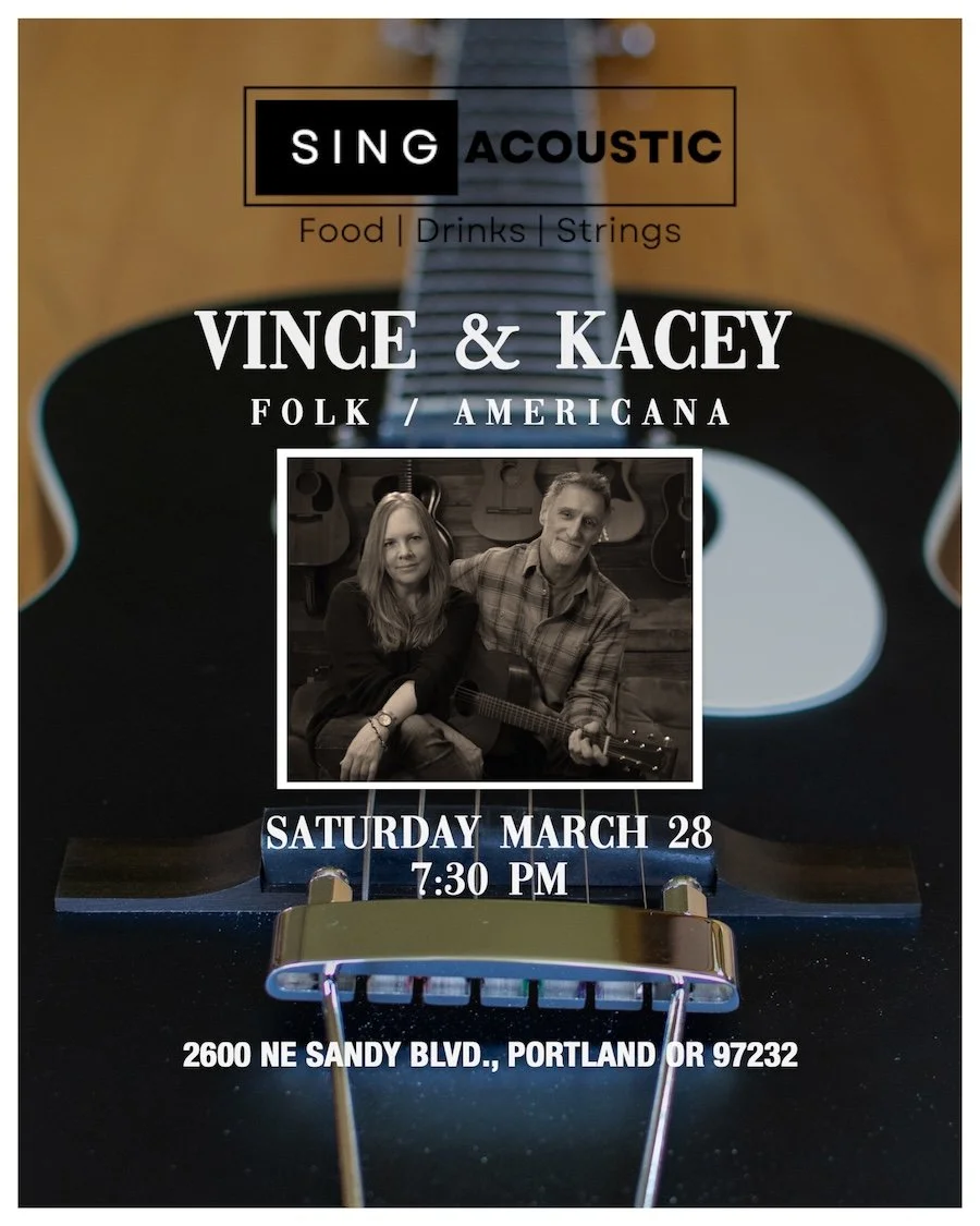 Vince & Kacey bring their vocal harmony driven good vibe folk lounge act to SingAcoustic, a new restaurant and music venue on NE Sandy Blvd at 26th. Please come check it out!