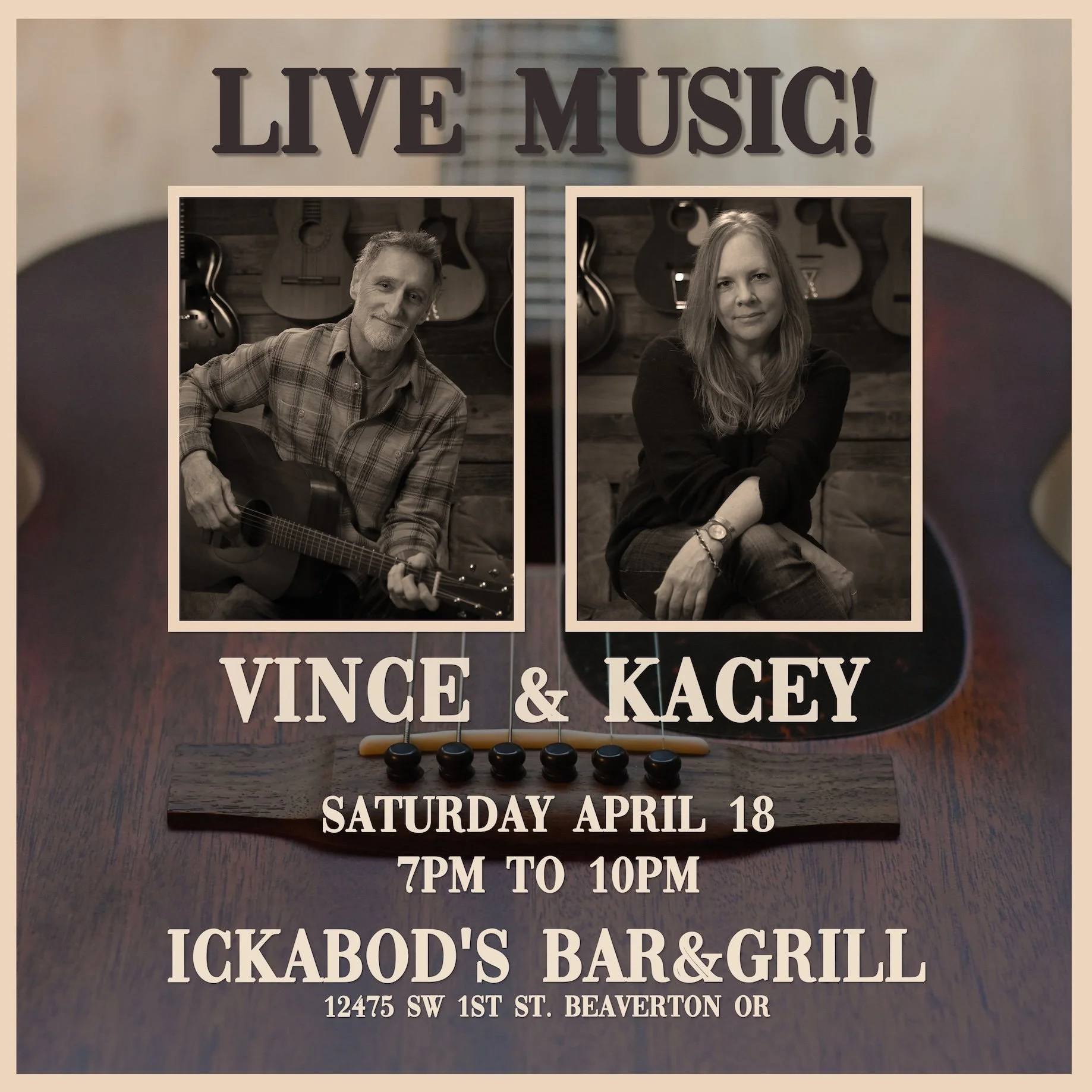 Saturday April 18: Your taxes are done, why not come see Vince & Kacey at Ickabod’s, 7-10pm?